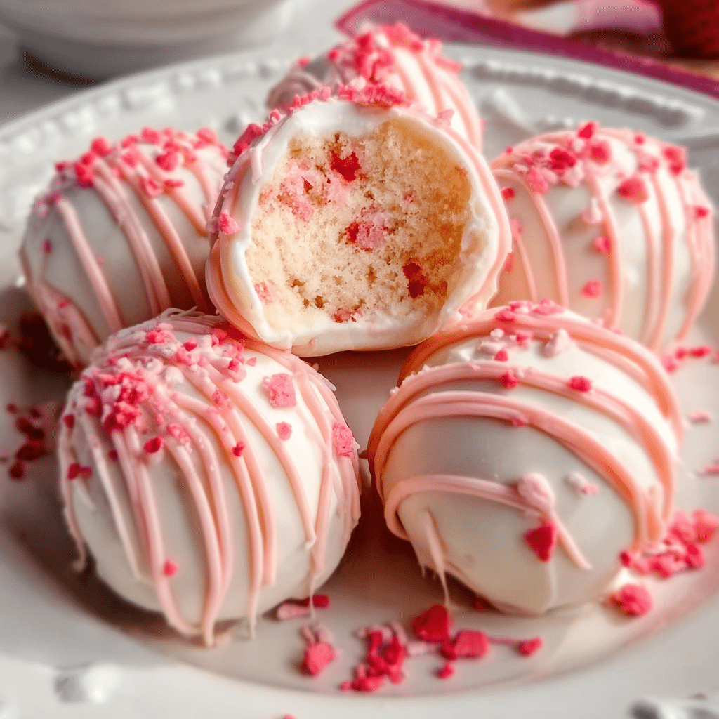 Easy no-bake strawberry cake mix balls made with sweet strawberry cake mix, cream cheese, and a smooth chocolate coating a fun bite-sized dessert perfect for parties, holidays, or gifting.
