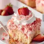 Serving Strawberry Crunch Poke Cake is easy! Cut the cake into squares and place them on individual dessert plates. You can also serve them with a dollop of extra Cool Whip on top or a drizzle of chocolate sauce for a twist. Pair the cake with a scoop of vanilla ice cream or fresh whipped cream for an extra indulgent dessert.