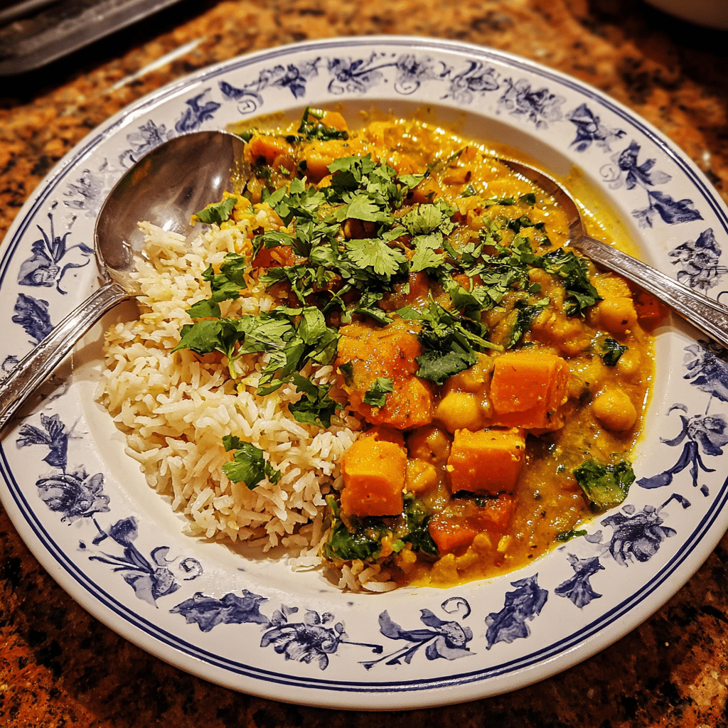 A warm, comforting curry made with tender sweet potatoes, protein-rich chickpeas, creamy coconut milk, and aromatic spices. Perfect for an easy weeknight dinner.