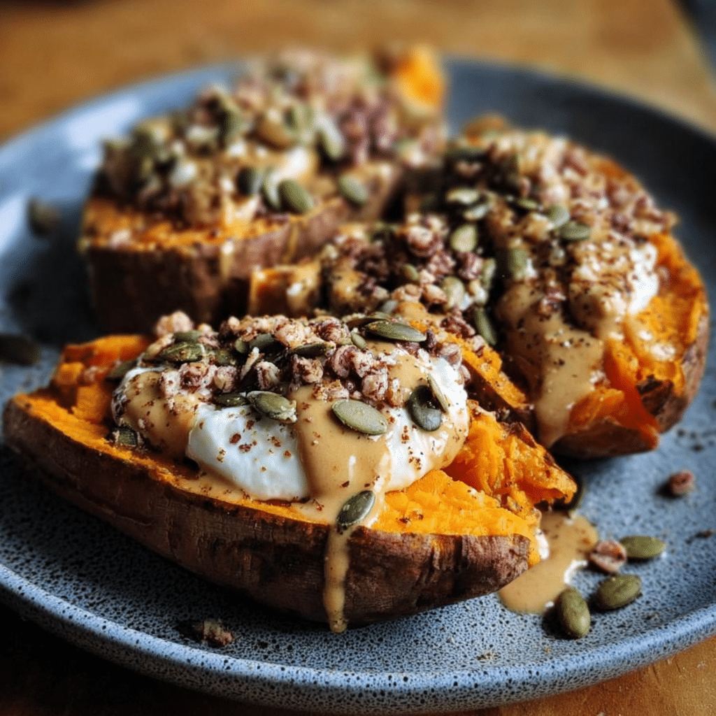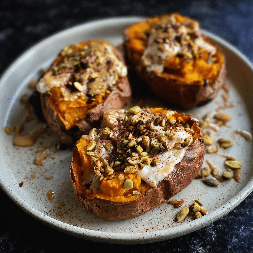 Creamy roasted sweet potatoes topped with tangy Greek yogurt, nutty almond butter, and crunchy pepita granola a wholesome breakfast or snack that’s both nourishing and naturally sweet.