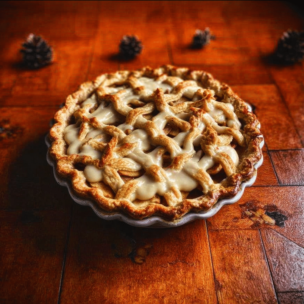 Design a fall-inspired Toffee Apple Pie with Vanilla Custard incorporating pure maple syrup in the filling and chopped toasted pecans for added texture and warm autumn flavors that complement apples perfectly.