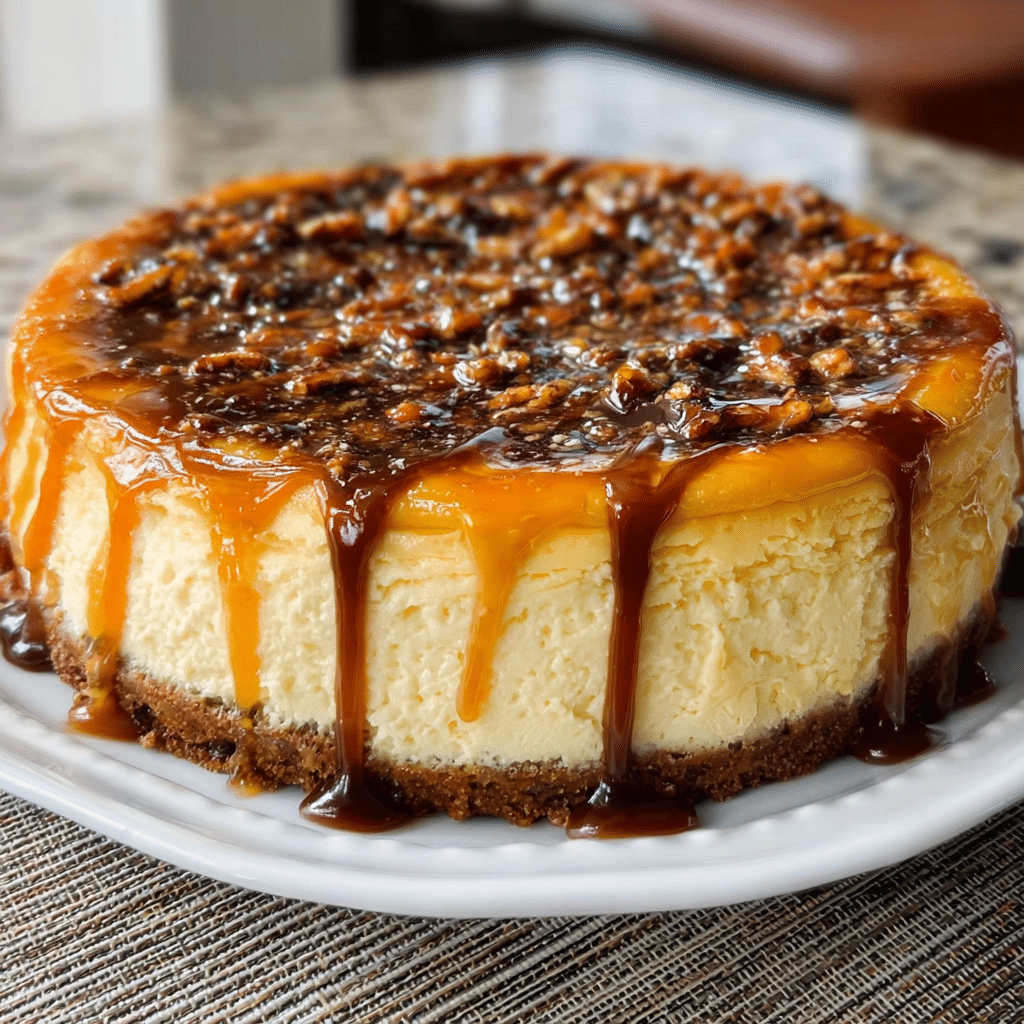 Turtle Cheesecake layers creamy vanilla cheesecake with caramel ribbons, toasted pecans, and chocolate ganache topping over buttery graham crust. Ultimate crowd-pleasing dessert combines turtle candy flavors in rich baked form.